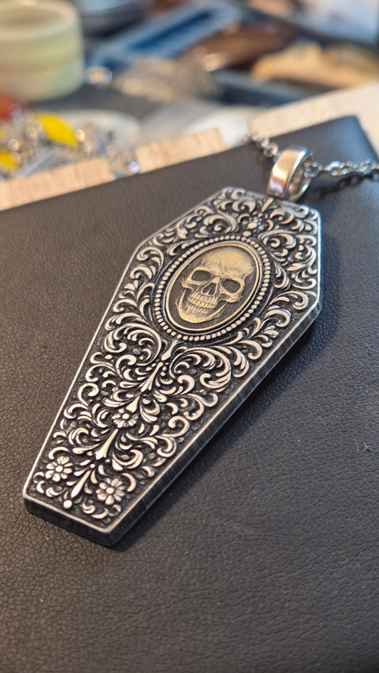 Filigree Coffin Necklace with Brass Skull Inlay