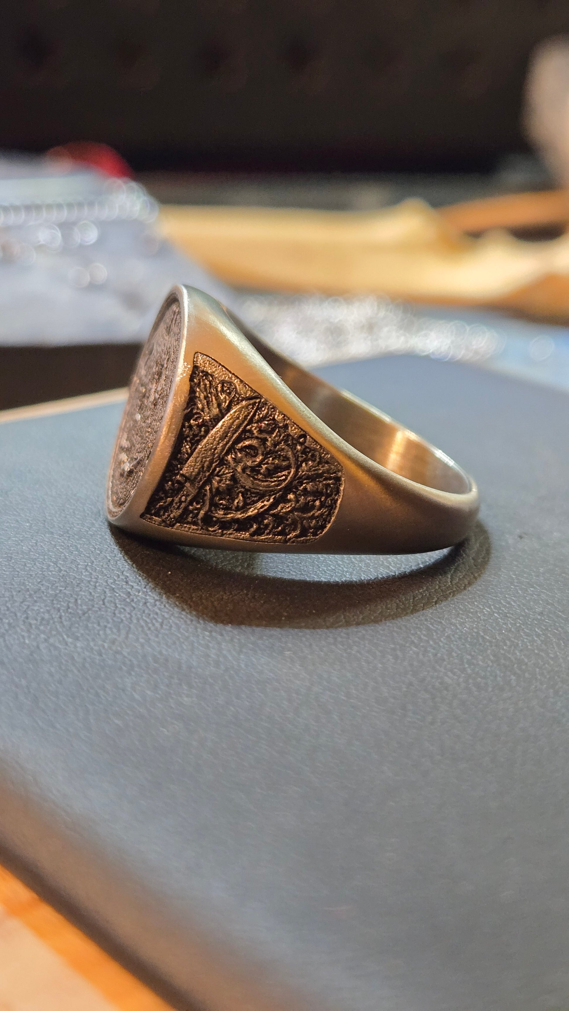The finish has been intentionally darkened to deepen the shadows and bring out every cut and texture, giving the ring a worn, almost relic-like presence. It looks less like jewelry and more like something pulled from a forgotten evidence box.