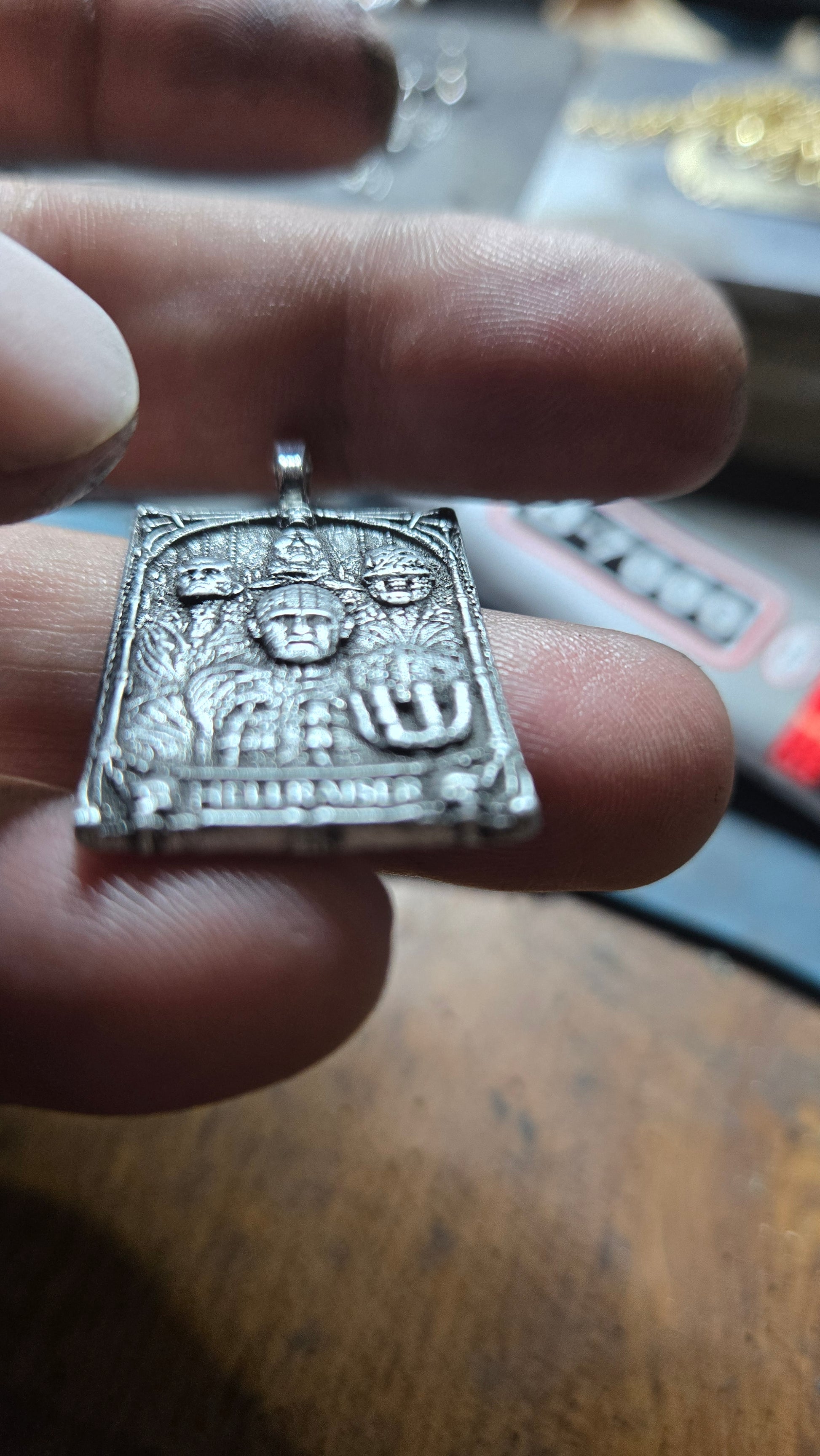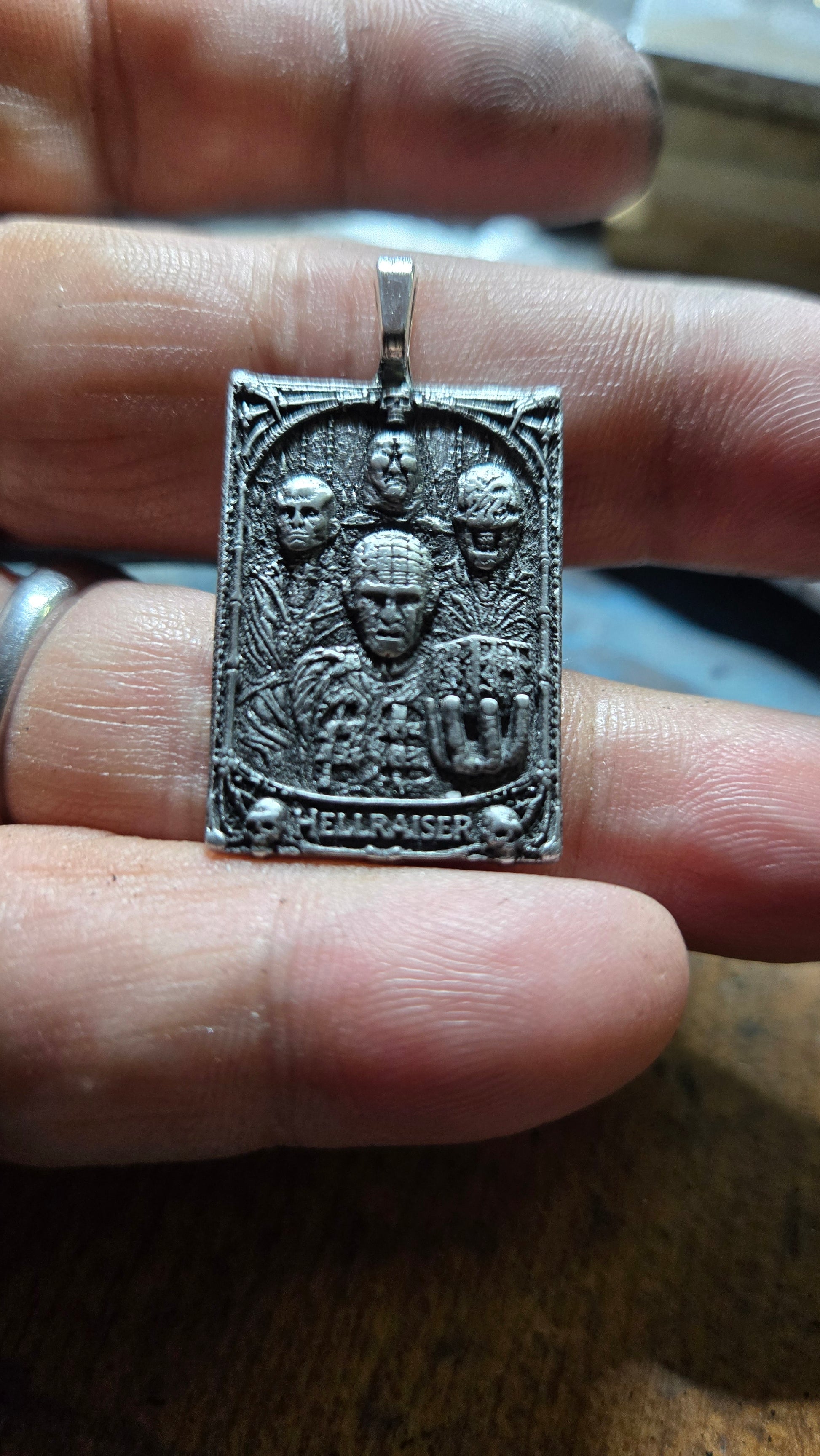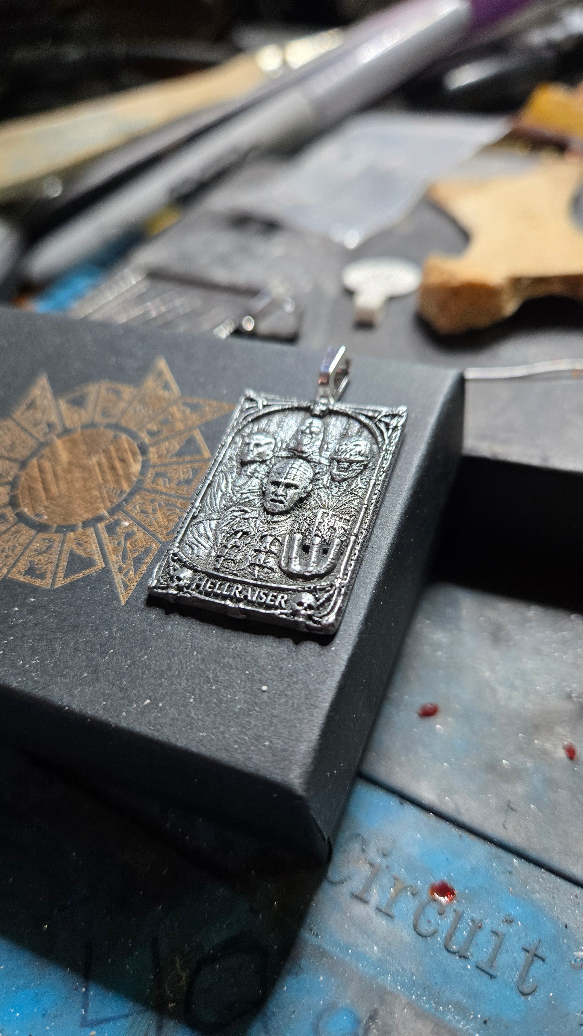 This Hellraiser inspired pendant captures the four original Cenobites in a deep 2.5D bas relief, sculpted with real depth and shadow so every line, chain, and scar stands out like carved stone.