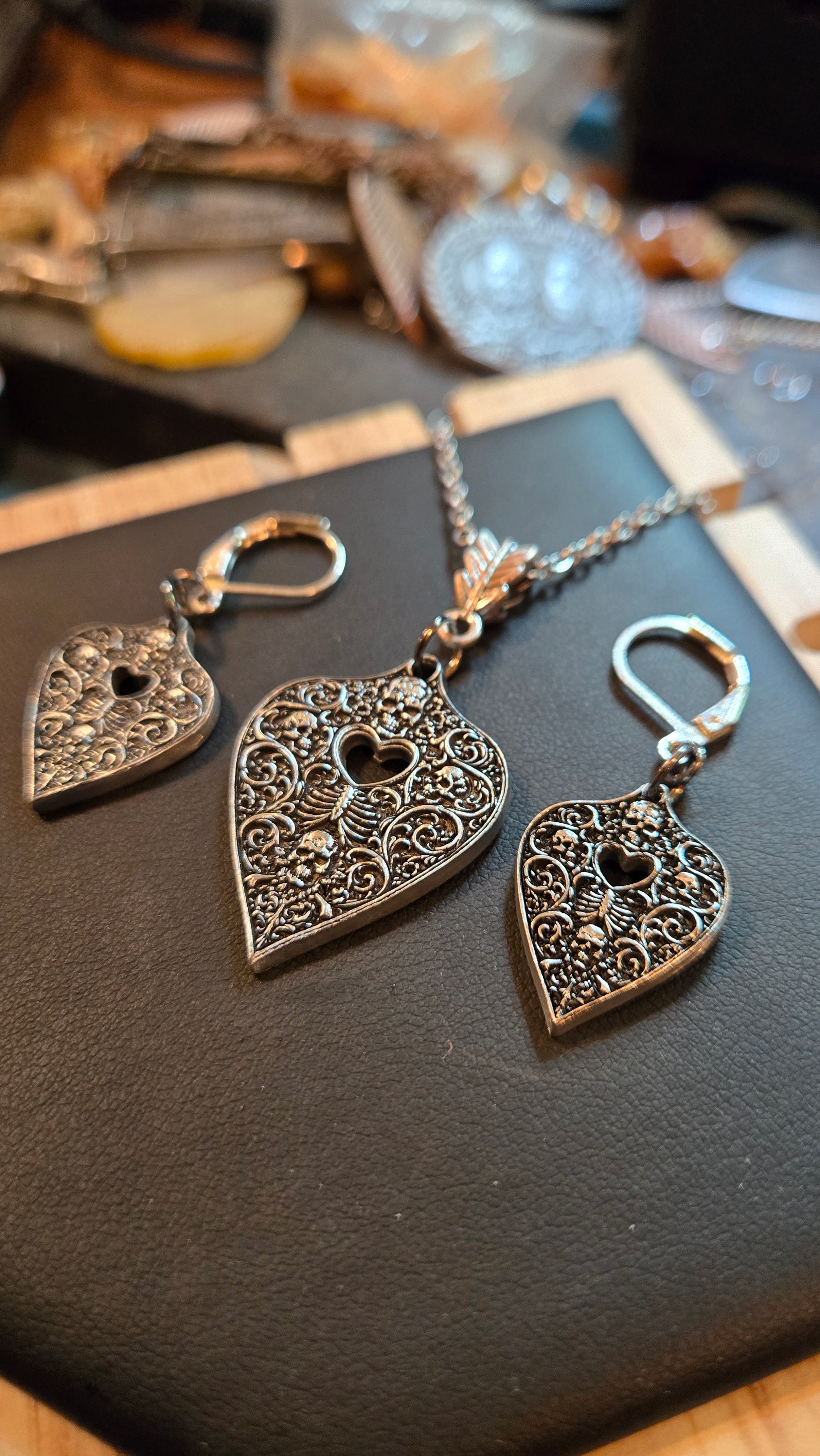 The planchette pendant is finished with intricate scrollwork and skull details that give it depth and an aged, almost antique look. The matching earrings echo the same design, keeping the set cohesive and intentional.