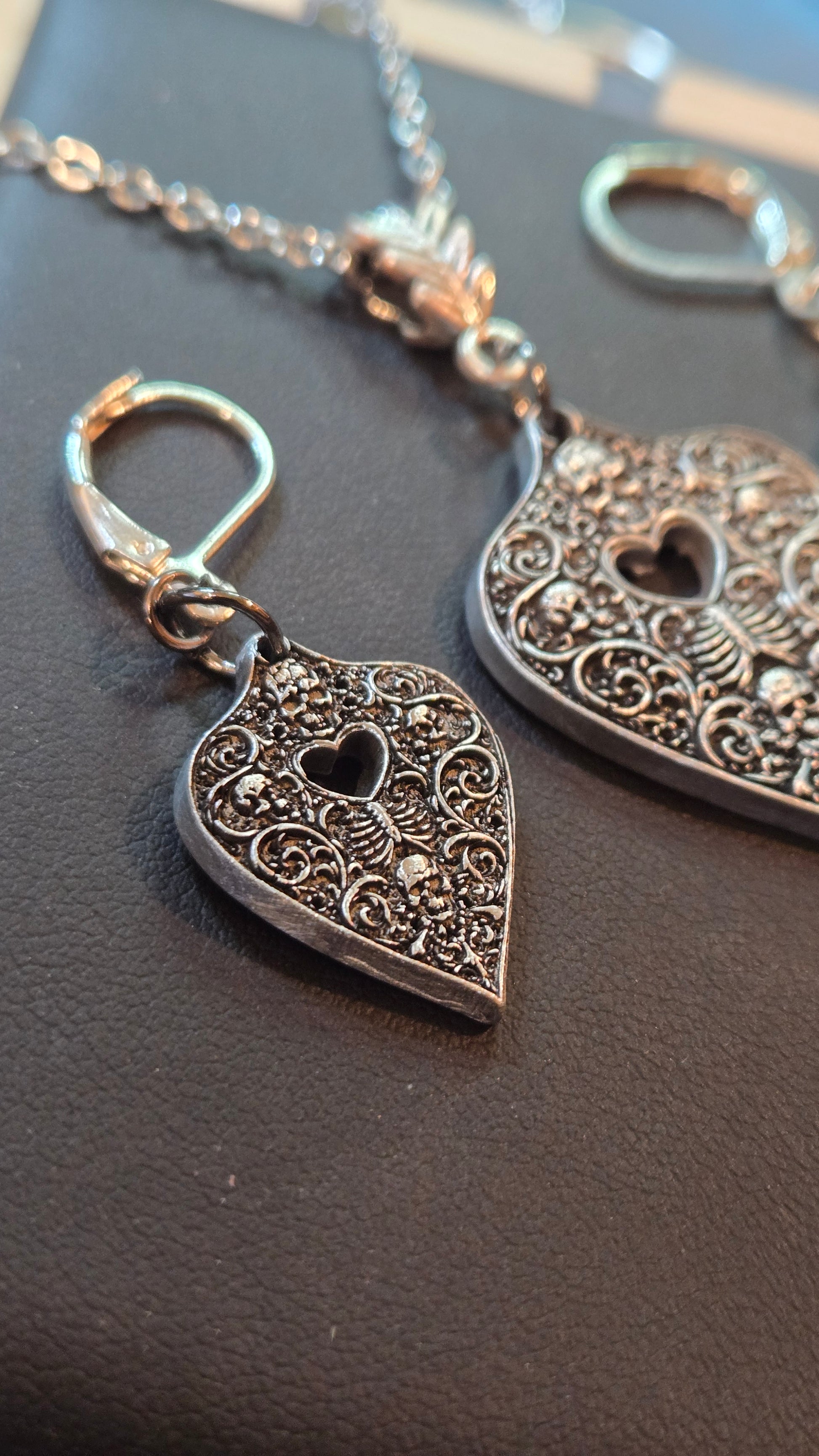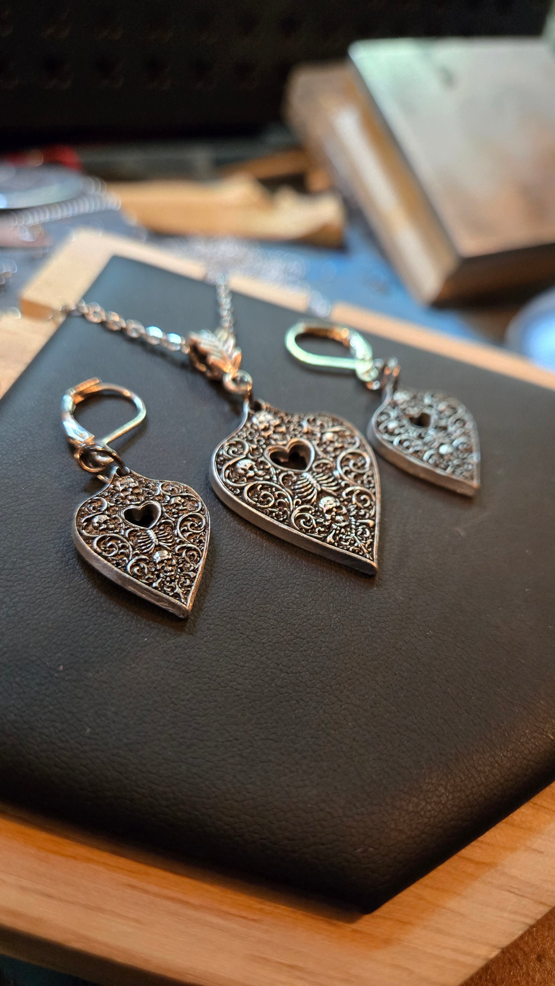 Custom Skull Filigree Planchette Pendant & Earring Set