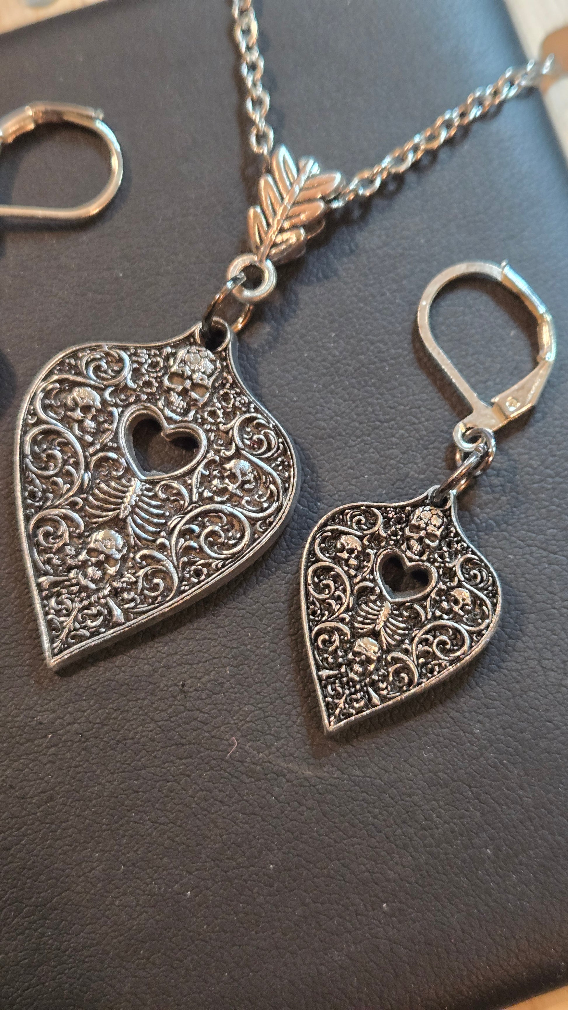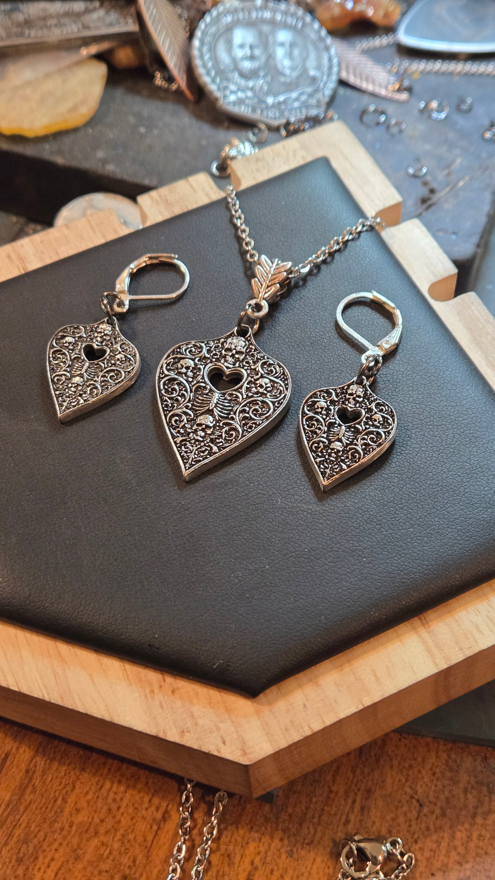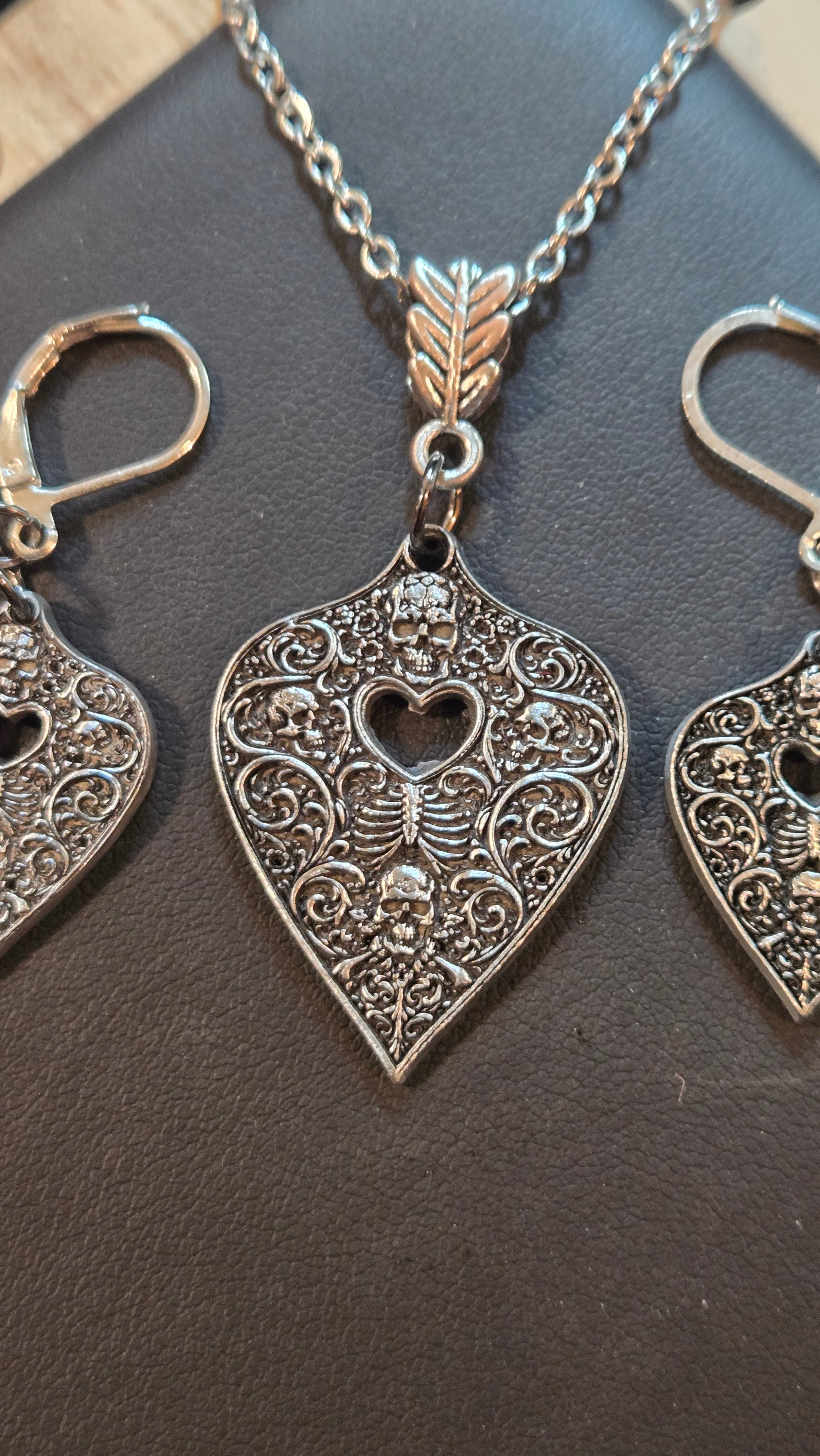 This is a matching planchette necklace and earring set featuring detailed skull filigree with a dark, vintage inspired feel. Ornate without being overdone, this set is made for people drawn to witch boards, gothic imagery, and symbolic jewelry.