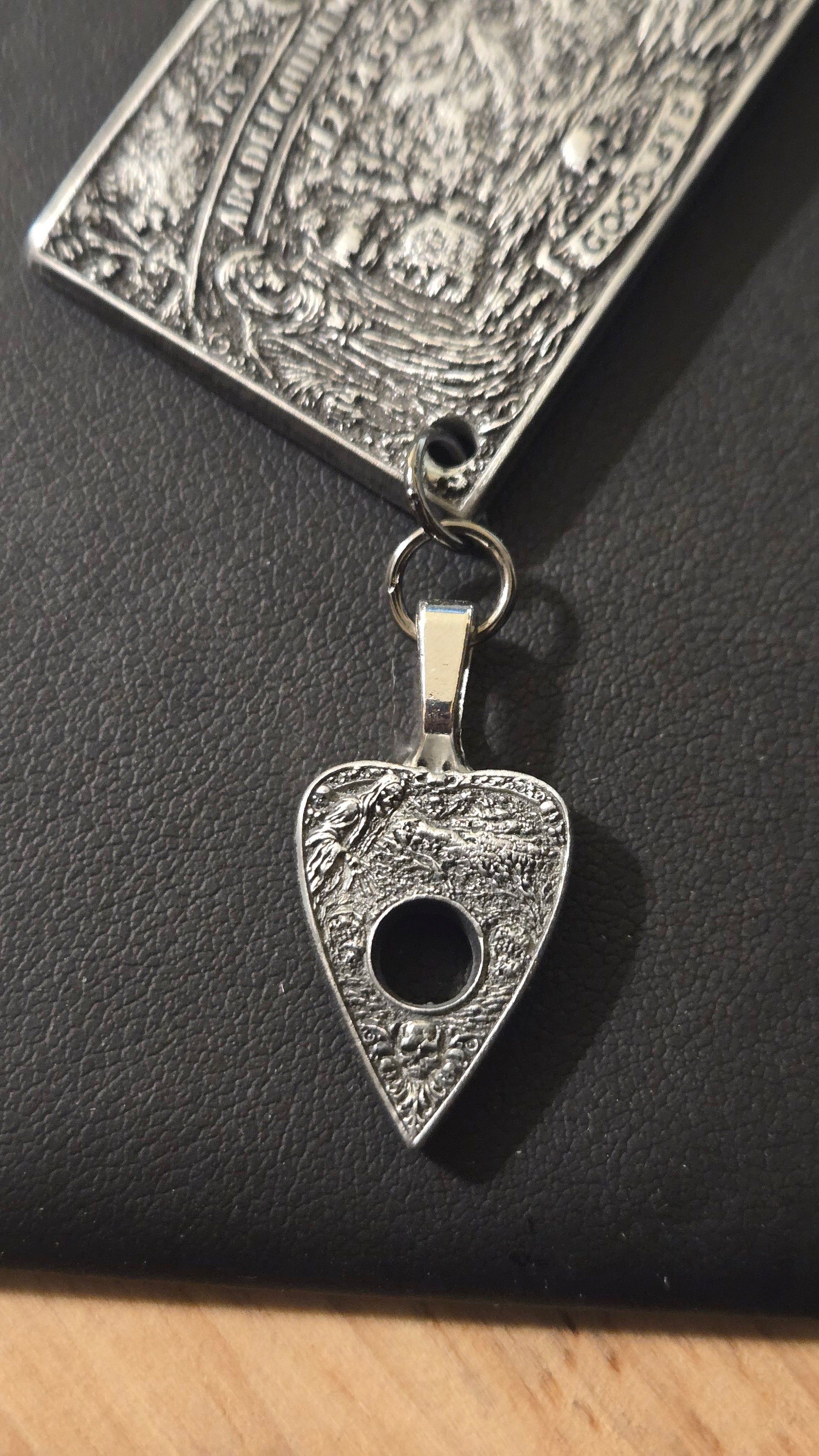 The main pendant features a detailed witch board design, textured and aged to feel like something pulled from an old drawer or forgotten altar. Hanging beneath it is a matching planchette charm, connected so it moves freely, adding motion and weight to the piece. When worn, it has a subtle presence—quietly unsettling in the best way.