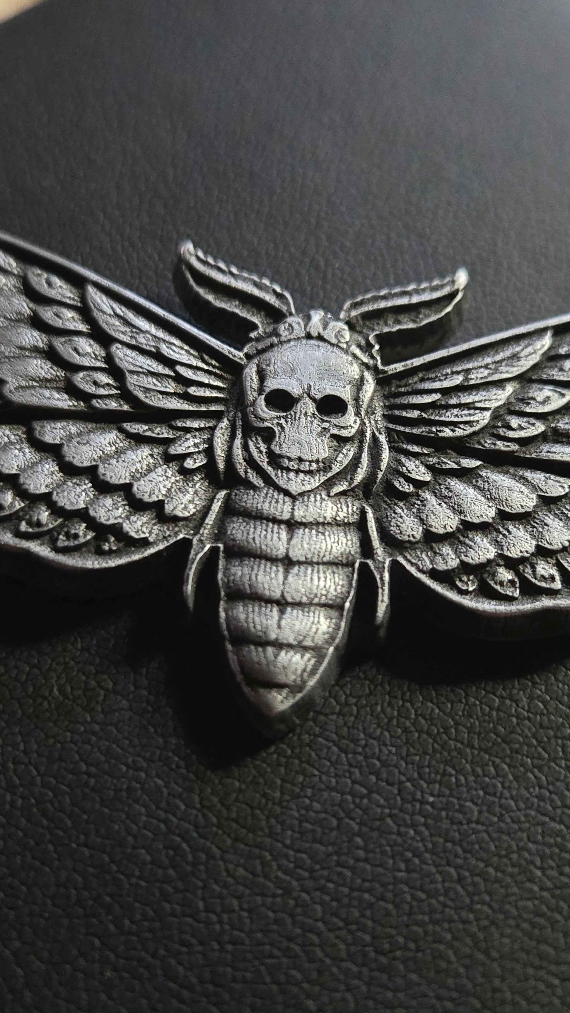 My Death Moth Pendant is carved in deep 2.5D relief, capturing that eerie moment where beauty and decay meet. The wings stretch wide, heavy with carved texture, feathered patterns, and crescent moons—like an old ritual symbol come to life. And right at the center sits the part no one can ignore: