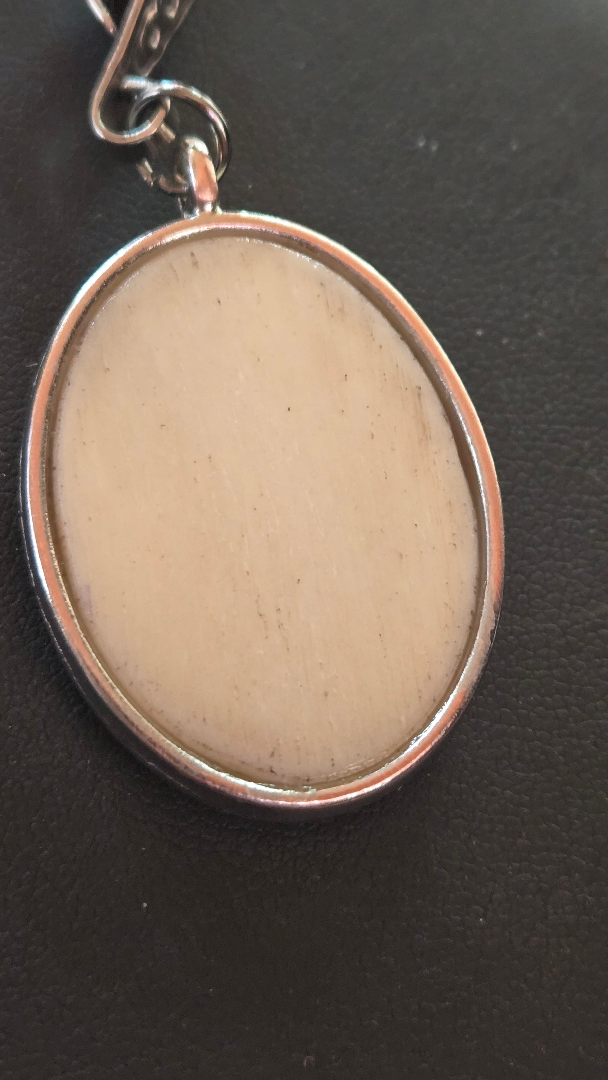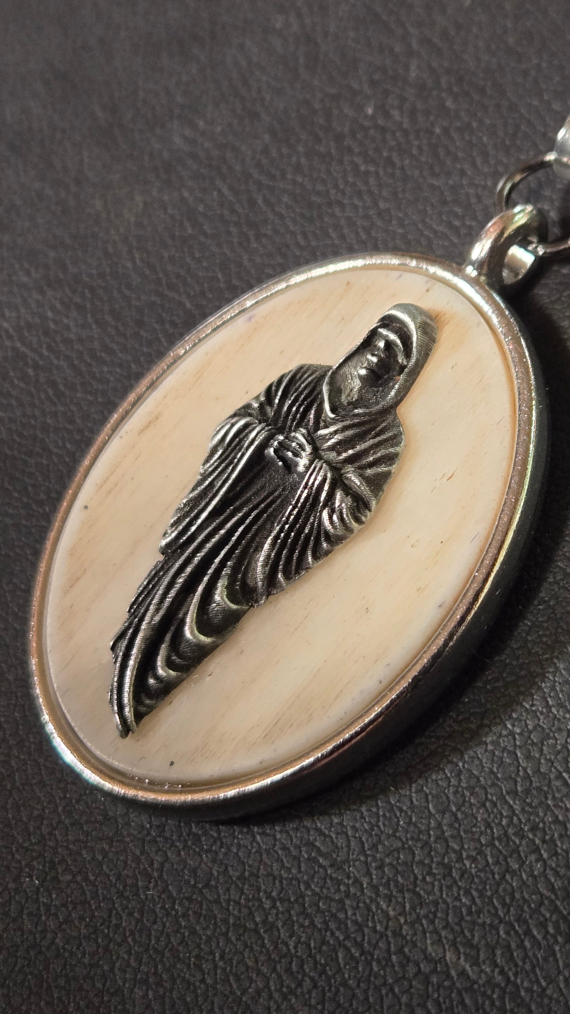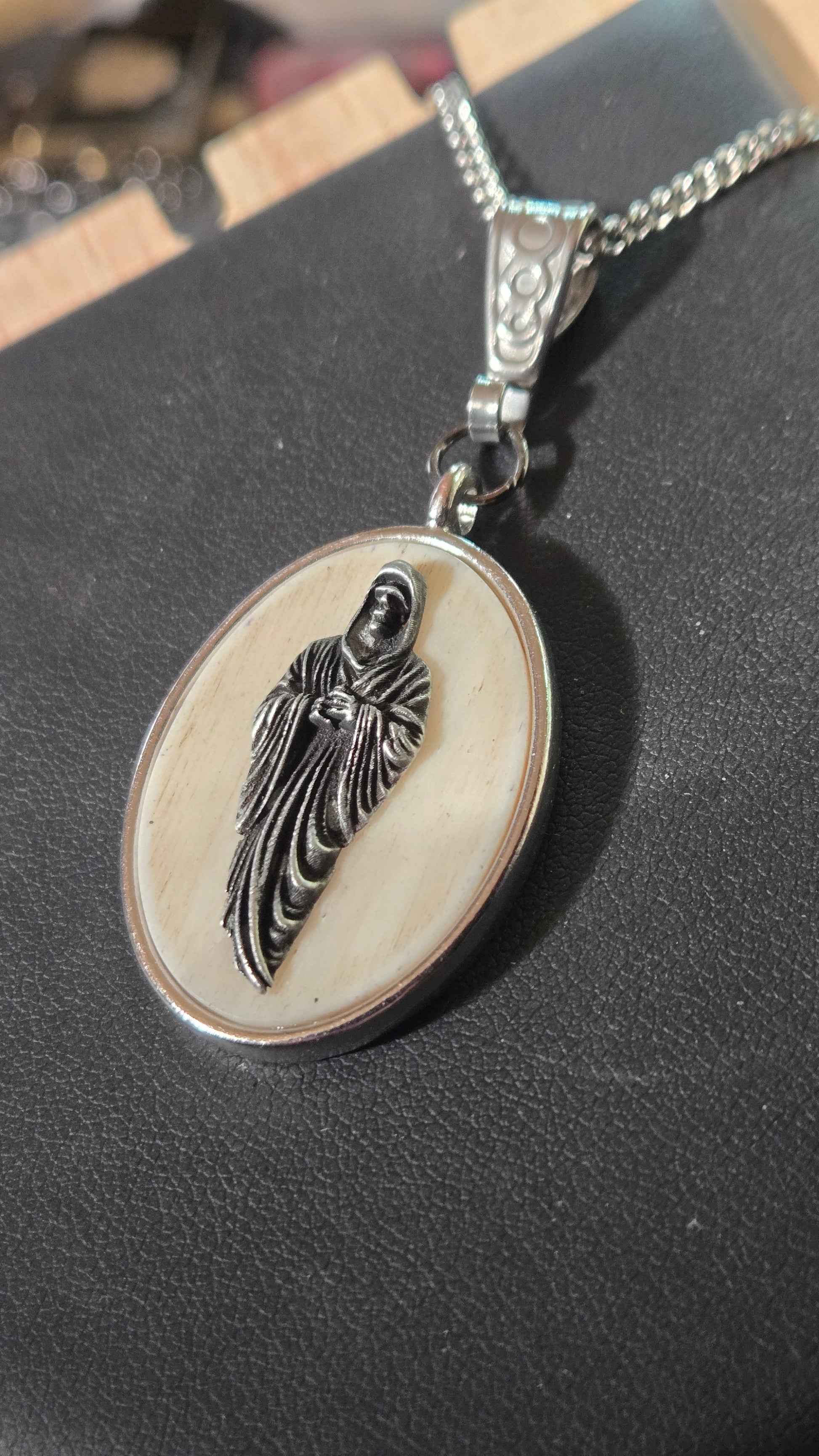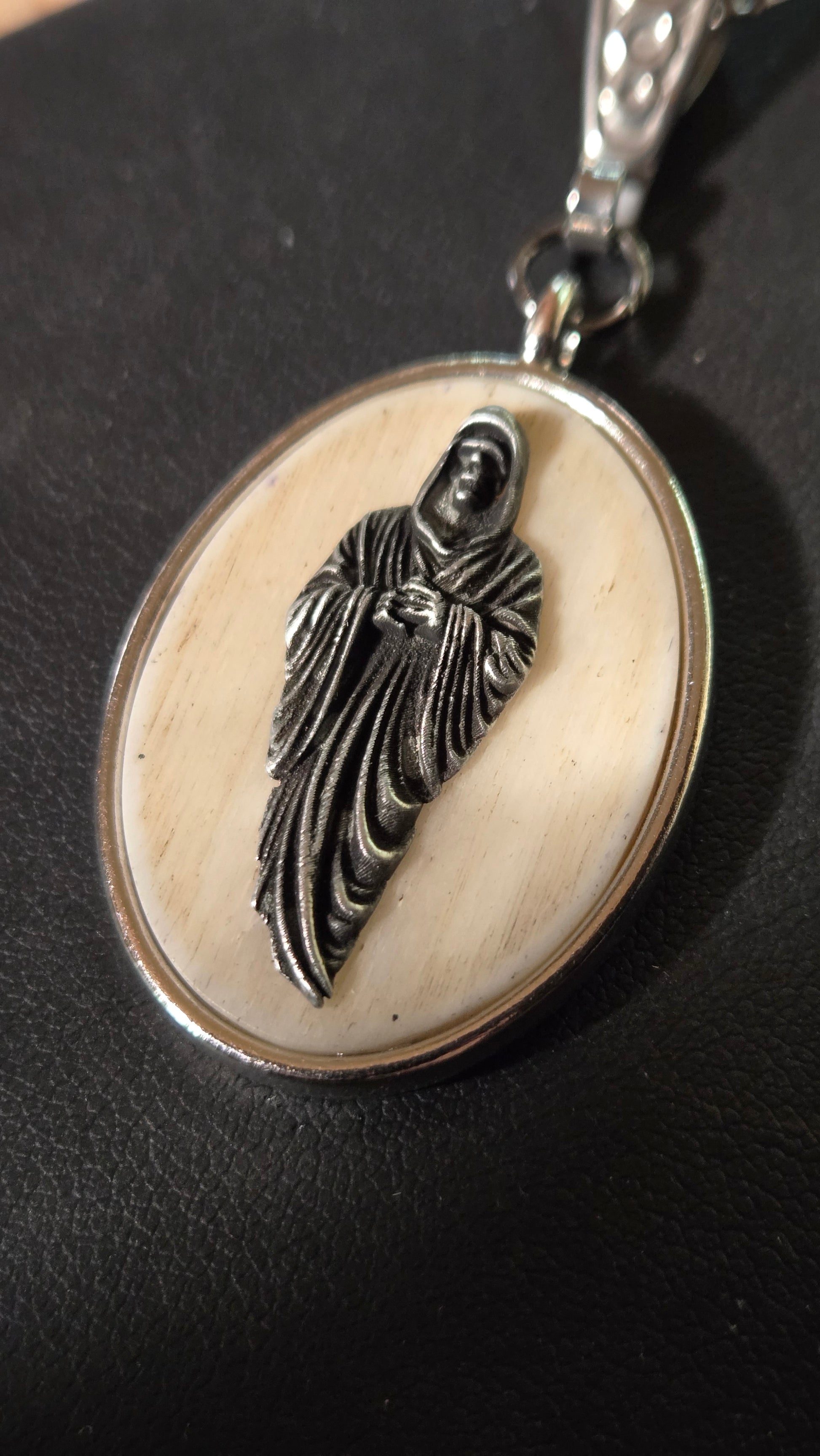 This pendant is made from a real human bone fragment, carefully hand-shaped into a smooth oval and set with a detailed metal reaper figure. The bone carries its natural tone, grain, and subtle markings. No two pieces like this will ever exist again.