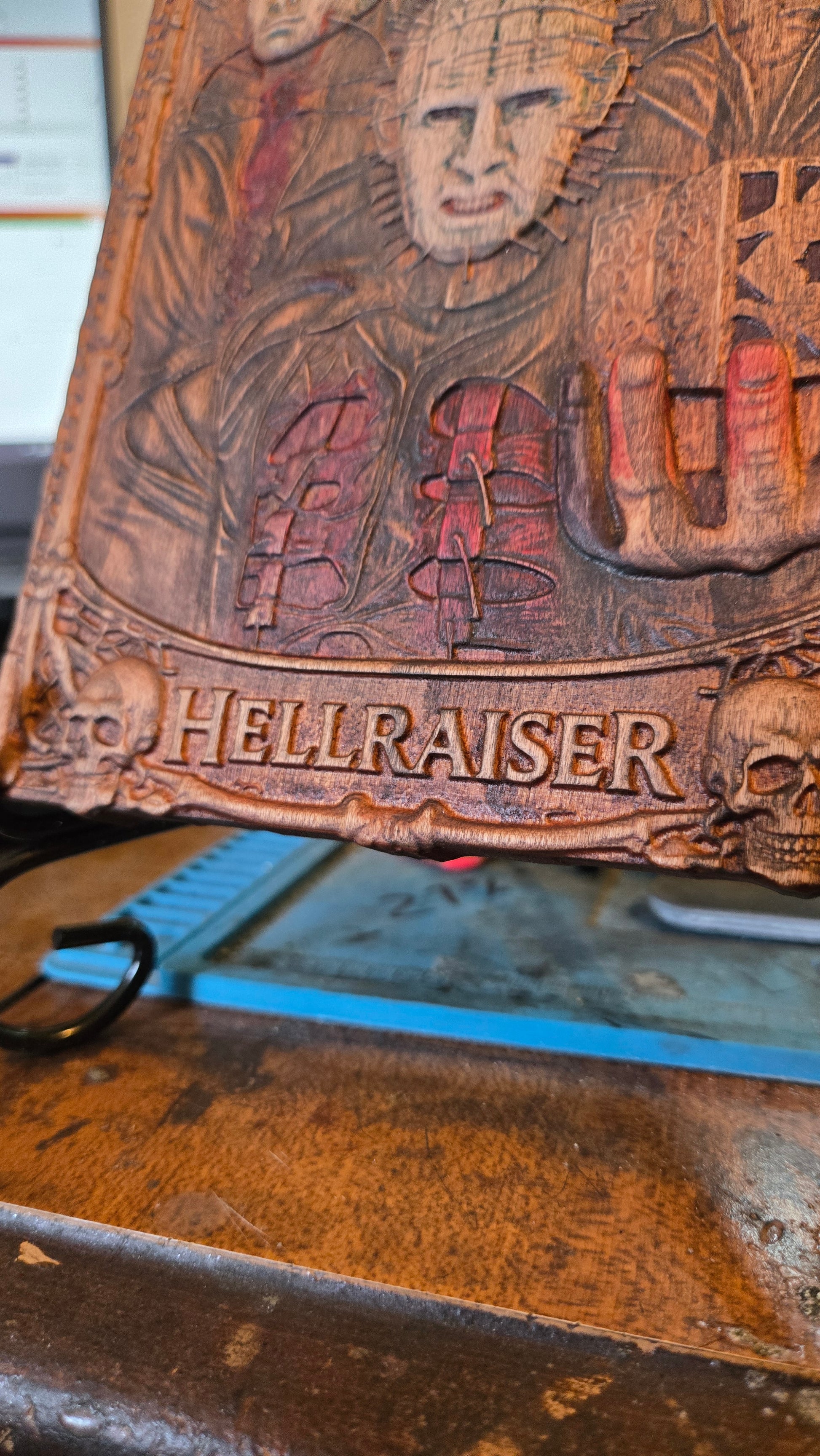 After the carving was completed, I hand colored and aged the relief to bring out the depth and texture of the carving. The colors are subtle and intentionally distressed to give the piece a worn, cinematic feel rather than a bright painted look.